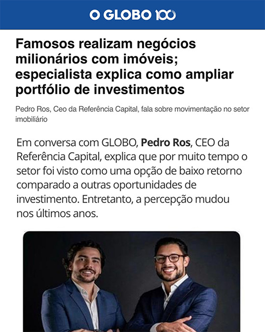 Pedro Ros é o CEO da Referência Capital, a maior assessoria imobiliária do Brasil, com mais de R$500 milhões em investimentos imobiliários realizados apenas nos últimos 24 meses.